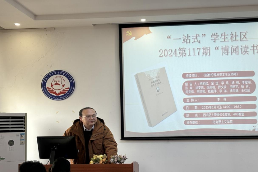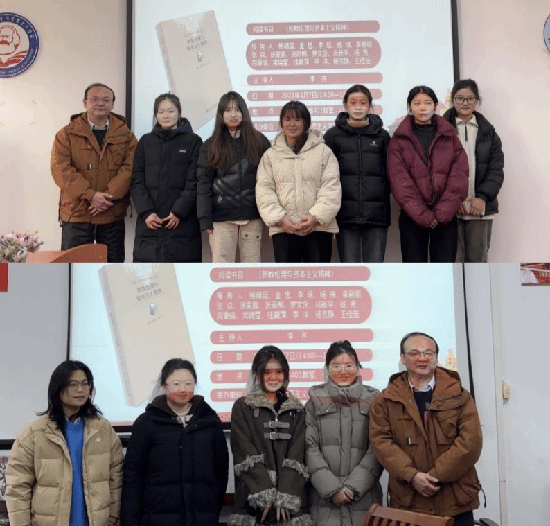 本网讯(通讯员 张悦悦 刘欣)1月7号下午,我院第117期“博闻读书会”在理论电费理论一站式学生社区中心(求是楼401教室、403教室)顺利召开。本次读书会的主题为资本主义形成的精神支柱,围绕着韦伯的著作《新教伦理和资本主义精神》展开讨论。本次读书会由李齐老师主持。参加此次读书会的14位研究生主讲人为2023级鲍明晨、金想、李晗、杨绵、24级张雨桐、罗文含、吕新宇、杨秀、周雯倩、常晓莹、桂颖萍、李洋、杨雪静、王佳瑶。院学术部“博闻读书会”活动小组组织了此次读书会。