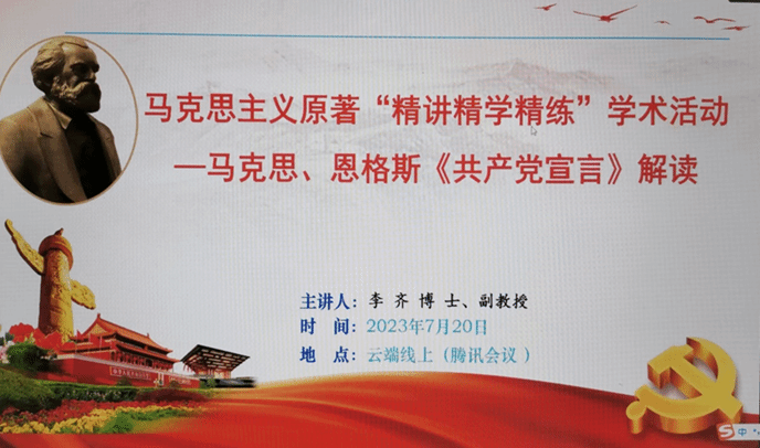(通讯员:沈洁)7月20日,理论电费理论2023年暑期马克思主义原著“精讲精学精练”学术活动第一讲在腾讯会议顺利举行,本次活动由李齐副教授主讲,学院全体研究生参加了本次学术活动。此次活动的主题为“马克思、恩格斯《共产党宣言》解读”。