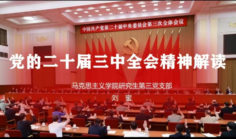 刘蜜同志讲授微党课。她就中国共产党第二十届中央委员会第三次全体会议精神的内涵和关注重点进行了讲解,并详细梳理出了从改革开放以来党的历届“三中全会”承担着经济发展和经济改革的重大使命。她带领全体党员对党的二十届三中全会审核通过的《中共中央关于进一步全面深化改革、推进中国式现代化的决定》进行原文学习,明确指出该《决定》既是党历史上又一次重要的纲领性文献,也是党的十八届三中全会以来全面深化改革的实践续篇,更是新征程中推进中国式现代化的新时代篇章,要求全体党员将学习和贯彻党的二十届三中全会精神作为当前和今后一个时期的一项重大政治任务。她认为学生党员应当通过多种形式学习和领会党的二十届三中全会精神,切实将其转化为学习和工作的强大动力。