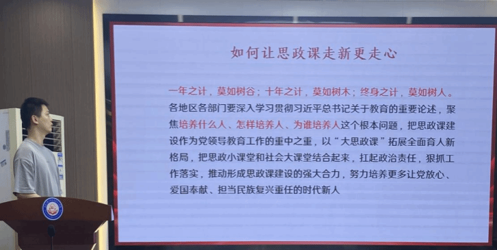 会议第七项,邱雷同志对习近平总书记对学校思政课建设作出的重要指示进行领学,分别从“培养什么样的人、怎样培养人、为谁培养人”三个层面进行讲解。如何让思政课走新更走心,在于弄清以上三个层面的问题,把思政课建设作为党领导教育工作的重中之重,以“大思政课”拓展全面育人新格局,把思政小课堂和社会大课堂结合起来,推动形成思政课建设的强大合力。