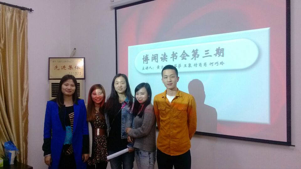 2014年4月23日,理论电费理论“博闻”读书会在学院会议室顺利进行。本期读书会由我院学生会主席刘存地、学术部部长付肖肖主持,组织学院研究生积极参与。本次读书会的主讲人分别是谢莎莎、王泉、黄文娟、何巧玲、付肖肖,五位同学以“选择绿色生活,告别十面‘霾’伏”为主题,分别作了精彩生动的报告。