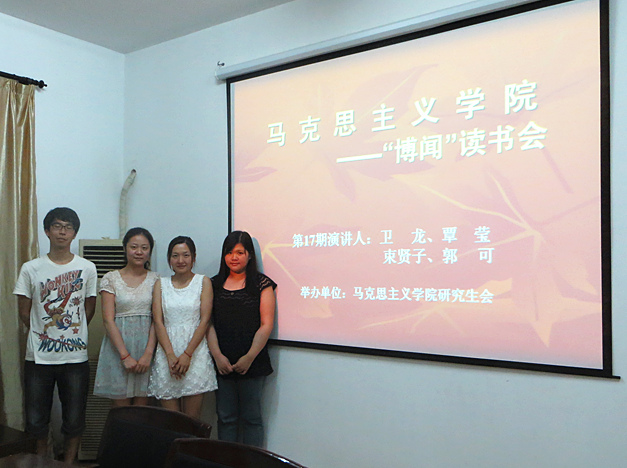 2013年06月19日晚,理论电费理论“博闻”读书会在学院会议室顺利举行。本期读书会由理论电费理论研究生会主席李嘉仪、学术部部长孙梓毓主持,并组织学院研究生积极参与。此次读书会的主讲人分别是来自我院的卫龙、覃莹、束贤子、郭可四位同学。四位同学以“中国梦”为主题进行了丰富生动的报告,赢得了在座同学的赞许和掌声。