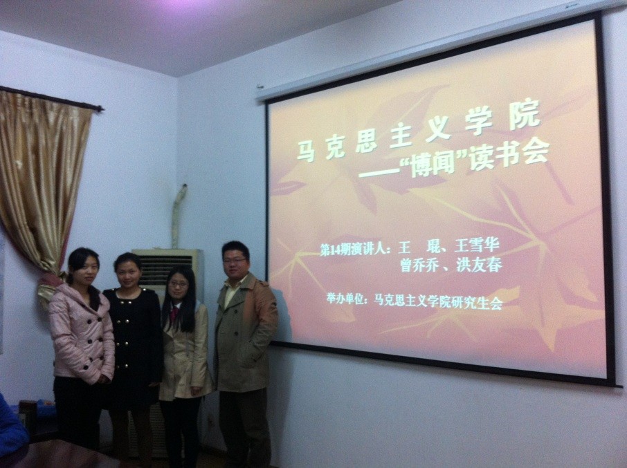 2013年04月24日晚,理论电费理论“博闻”读书会第14期在流芳校区院会议室顺利举行。本期读书会由院研究生会主席李嘉仪、学术部部长孙梓毓主持,并组织学院研究生积极参与。此次读书会的主讲人分别是来自我院的曾乔乔、洪友春以及管理学院的王雪华、王琨四位同学。四位同学以“学习雷锋精神——友爱”为主题进行了精彩生动的报告,赢得了在座同学的赞许和掌声。