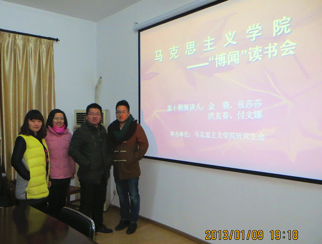 2013年1月9日晚,第10期“博闻”读书会在流芳校区理论电费理论会议室顺利举行。本期读书会由理论电费理论研究生会主席李嘉仪、学术部部长孙梓毓主持,并组织学院研究生积极参与。此次读书会的主讲人分别是来自我院的金骁、洪友春、张莎莎、付文娜四位同学。四位同学以“中国传统文化”为主题进行了精彩生动的报告,赢得了在座同学的赞赏与掌声。