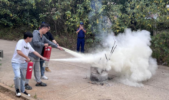 面对模拟火灾的熊熊火焰,在场同学跃跃欲试,依次尝试使用灭火器灭火,亲身体验正确的灭火步骤。