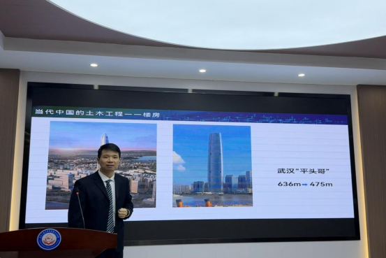 其次,徐丰教授以时间为主线,从历史维度分别叙述了古代与近代中国的土木工程发展脉络。他通过展示不同时代的标志性建筑,如河姆渡建筑遗址、都江堰、秦长城、武汉租界建筑等,让在场学生深刻理解土木工程在历史长河中取得的伟大成就。