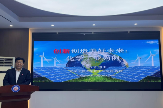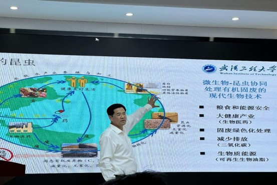 在课程接近尾声时,王存文教授向同学们展示了武汉工程大学在化工方面的科研成果,以有机废弃物昆虫生物转化技术为例,深刻阐述了现代化发展应推动数字经济、循环经济、生物经济等新经济体系构建。