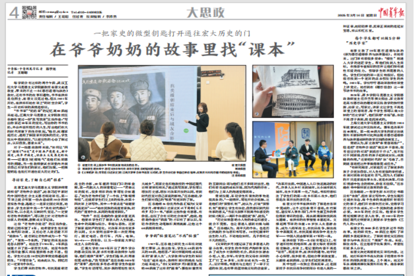 课程广受好评,崔晋文老师从未停下探索的脚步。今年春天,在得知爷爷生前战友的后人仍与爷爷生前部队保持联系之后,崔晋文便利用周末驱车前往湖南湘潭收集更多信息。这些新发现的碎片记忆,将成为下学期课堂上的鲜活案例。这堂“行走的思政课”,将会续写新的篇章。(审核:刘卫民 蔡明广)