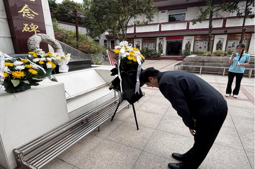 九峰烈士陵园松柏掩映,革命烈士纪念碑巍然矗立。在庄严肃穆的氛围中,蔡明广书记带领师生整齐列队,向革命先烈敬献花篮。洁白的菊花寄托着对英烈的无限追思,师生们垂首默哀,共同致敬那些为民族独立、人民幸福献出生命的英雄。