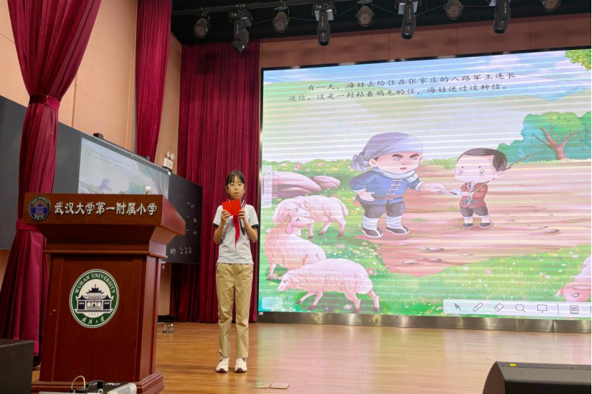 随后,武大一附小学生代表张爱文同学作为“第三代”宣讲人登台。她以稚嫩却坚定的声音,动情地向在场听众讲述了经典红色故事《鸡毛信》。故事中,主人公海娃在危难关头所展现的机敏与果敢,不仅深深渗透到她的日常学习生活中,更在她心中播下了红色精神的种子,成为支撑她成长的重要精神养分。
