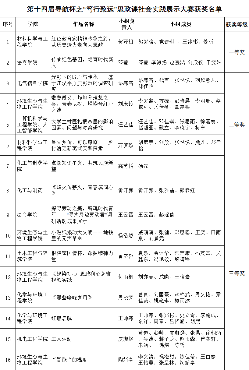 来自13个学院的16支学生团队围绕红色文化、志愿服务、养老、医疗、非遗文化、乡村振兴等主题进行了展示。在《红色教育家精神传承之路:从历史烽火走向大思政》的展示中,同学们将思政课上的红色感悟延伸到红色宣讲、红色调研中,探索传承红色基因的新模式;《光影下的匠心与传承——基于江汉平原皮影戏的调查研究》将非遗文化皮影戏搬上了舞台,用详实的调研成果展示了保护非遗文化的青年力量;《小贴纸撬动大文明——地铁里的无声革命》以情景剧的形式沉浸式展示了工大学子在维护公共空间文明、践行社会主义核心价值观方面的努力与坚守……活动中各个团队的精彩展示不仅生动展现了新时代青年关注社会热点的责任担当,更通过创新实践彰显了理论联系实际的思政教育成效,为现场观众呈现了一场有深度、有温度、有力度的思政课实践教学盛宴。经过激烈角逐,最终产生一等奖两个、二等奖五个、三等奖九个。