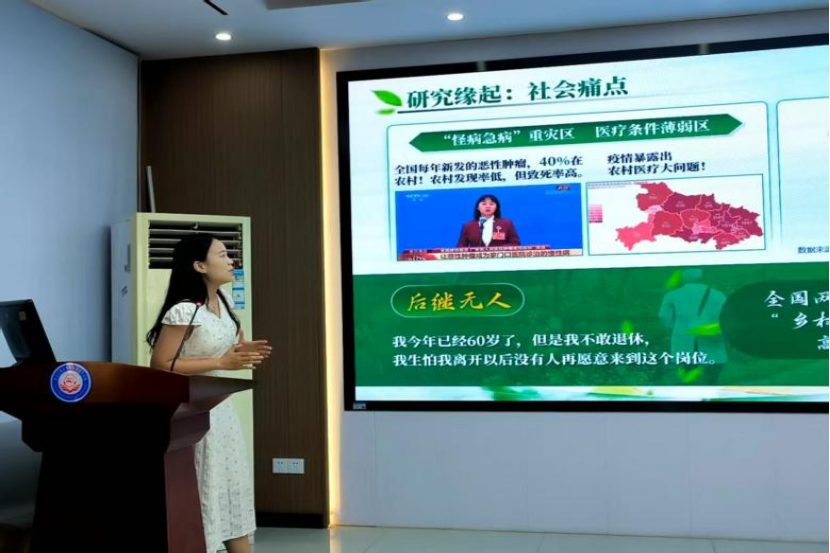 随后,今年荣获湖北省第十五届“挑战杯”大学生课外学术科技作品竞赛一等奖的团队项目——“医”路同行,徐嘉婧分享了他们在挑战杯省决赛现场的路演汇报内容。他们讲述了聚焦“大学生村医扎根基层”开展实践的全过程,为台下的同学们提供了极具价值的经验参考。