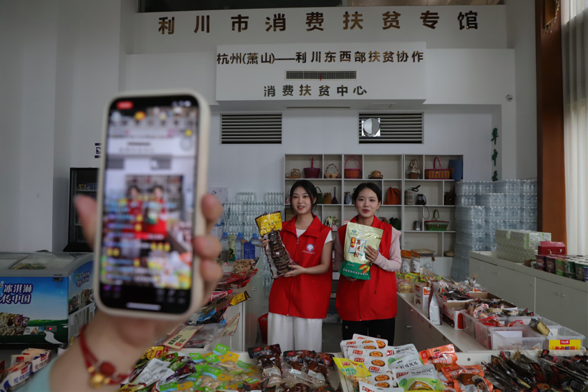 数字与助农同行。5G技术架起“云桥梁”,齐跃桥村成立直播助农工作站,让农产品“飞”向更广阔的市场。实践团成员走进锦绣山庄利川市消费扶贫专馆,与林晓娅老板携手开展助农直播活动。团队成员王佳怡和张悦悦担任主播,邀请林晓娅一同向屏幕前的网友介绍利川的特色农产品,如利川红茶叶、柏杨豆干等,用热情为齐跃桥村的助农添力。