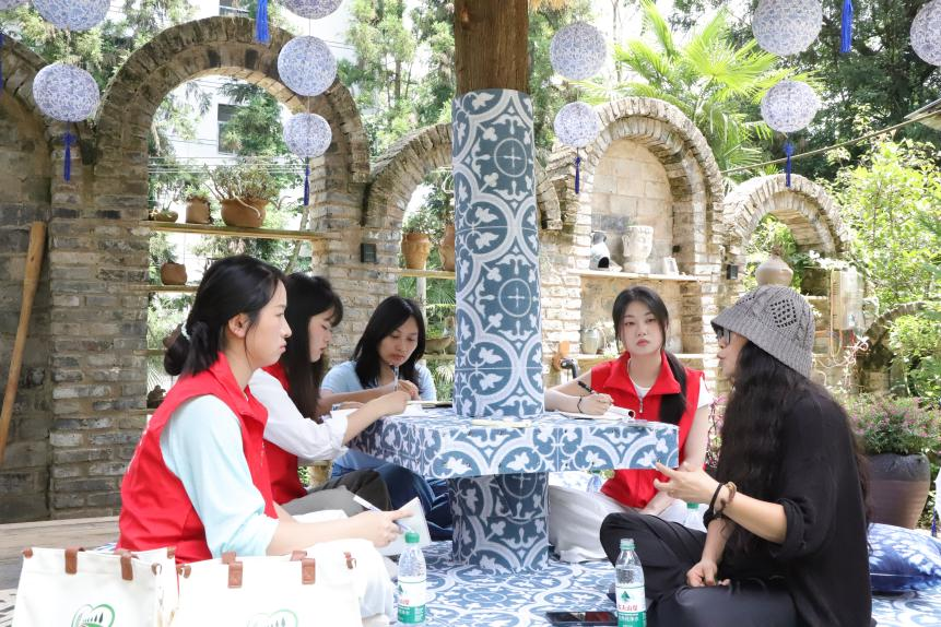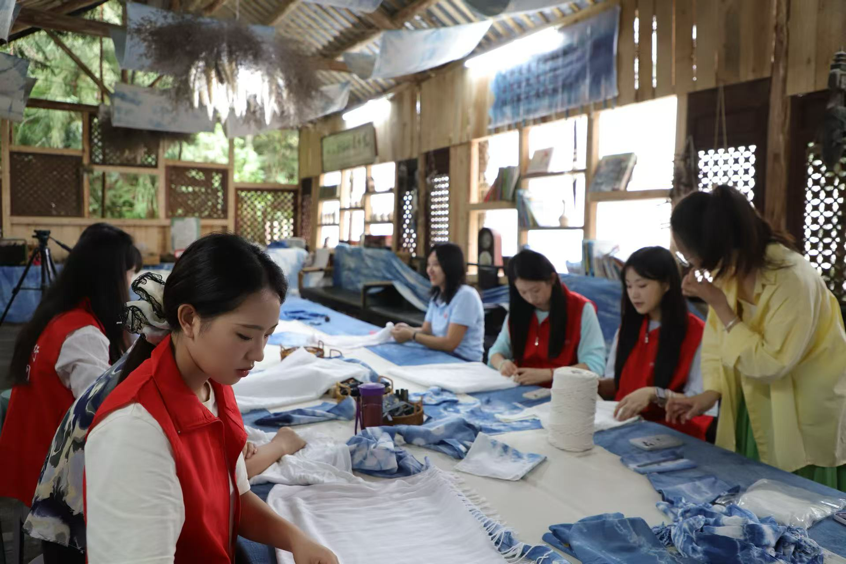 在“农旅融合+后工业文化”的发展路径上,齐跃桥村多点发力,绘就振兴画卷。民宿产业与非遗文化实现共舞,在旅游业带动下,“村花民宿”公共品牌应运而生,截至目前,全村已有52家民宿。涧山民宿老板许丹作为齐跃桥村民宿事业发展的“领头雁”,不仅将老房子打造为集吃、住、玩于一体的“亲子民宿”,还以“丹姐乡村旅游工作室”为平台免费为村民直播推广。实践团成员特意来到涧山民宿体验非遗扎染项目,学习扎结、染色等传统技艺,亲手制作了扎染作品。实践团成员赵秀雯说:“这是一次难忘的体验,让我们在蓝白之间感受到了非遗文化与乡村旅游的融合魅力。”同时,实践团还向民宿经营者和游客发放问卷50余份,聚焦民宿经营现状、市场表现、服务能力等,摸清齐跃桥村文旅发展的潜力、问题根源及优化方向。调查发现客源多为周边城市退休康养人群,入住率随季节波动明显,游客普遍盼村内添些娱乐配套设施。这些发现将助力村庄在守好文化味的同时升级配套娱乐设施,引客来、留客住,让乡村文旅走得更远。