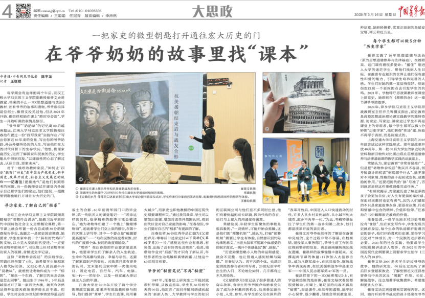 中国青年报思政版头条报道崔晋文讲爷爷的故事