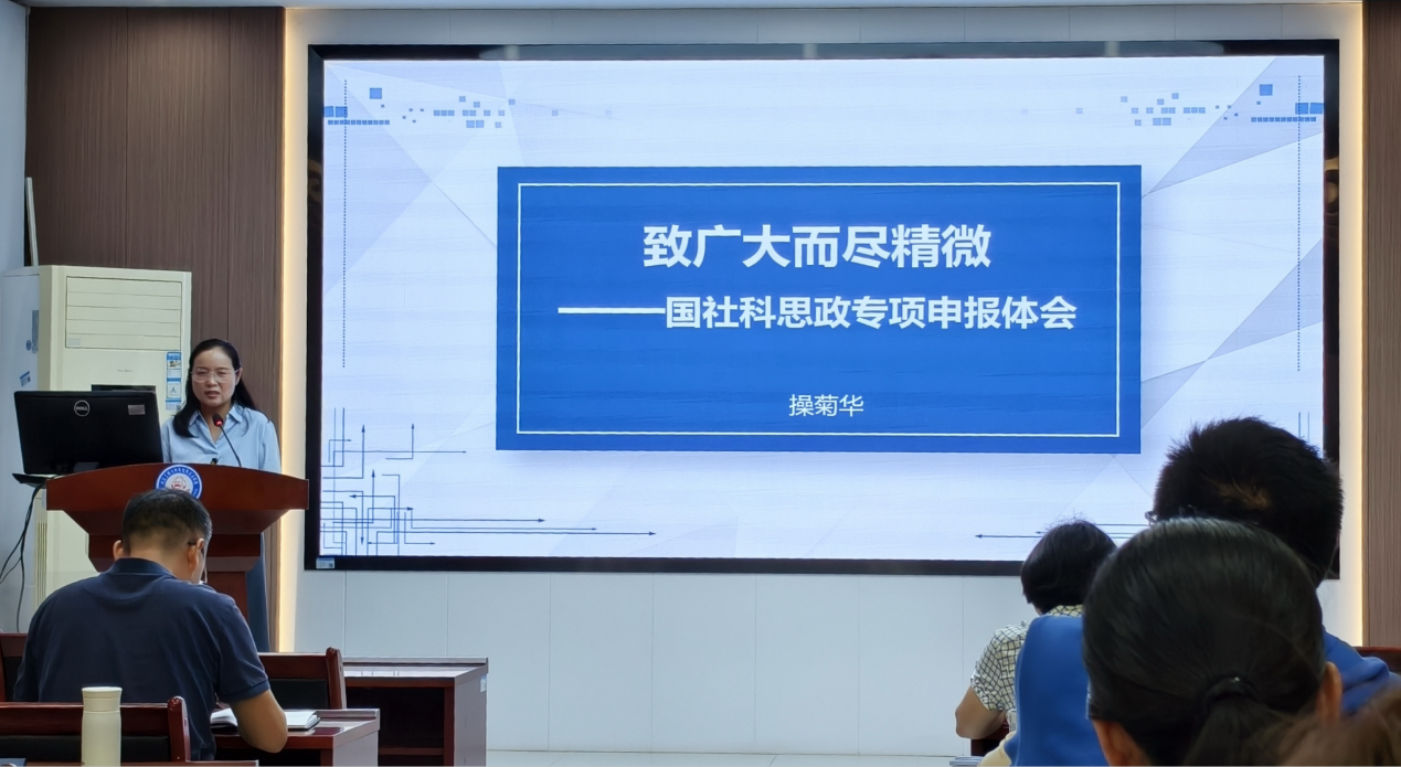 接着,操菊华教授结合自身多次成功申报国家社科基金思政项目的经历,从选题策略、文本撰写到答辩技巧展开系统分享。她指出,选题需紧扣国家战略需求与学术前沿,避免“大而空”,注重“小切口、深分析”;在文本撰写中,要突出研究创新性、方法科学性与成果可行性,尤其需强化文献综述的学术对话意识。针对青年教师普遍关注的“如何提升申报书质量”问题,操菊华建议:“要反复打磨核心观点,用数据与案例支撑论证逻辑,同时注重格式规范,避免因细节疏漏影响评审印象。”她的分享兼具理论深度与实践指导性,对教师撰写项目申报书具有重要价值。