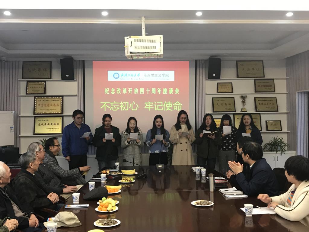 11月28日下午,在学院领导邀请下,数名退休老教师回到学院指导工作,并以“庆祝改革开放四十周年”为主题展开座谈会。参加座谈会的有学院党委书记吴秋凤教授、院长舒先林教授、辅导员延飞以及2018级全体在校研究生党员。学院党委书记吴秋凤主持了座谈会。