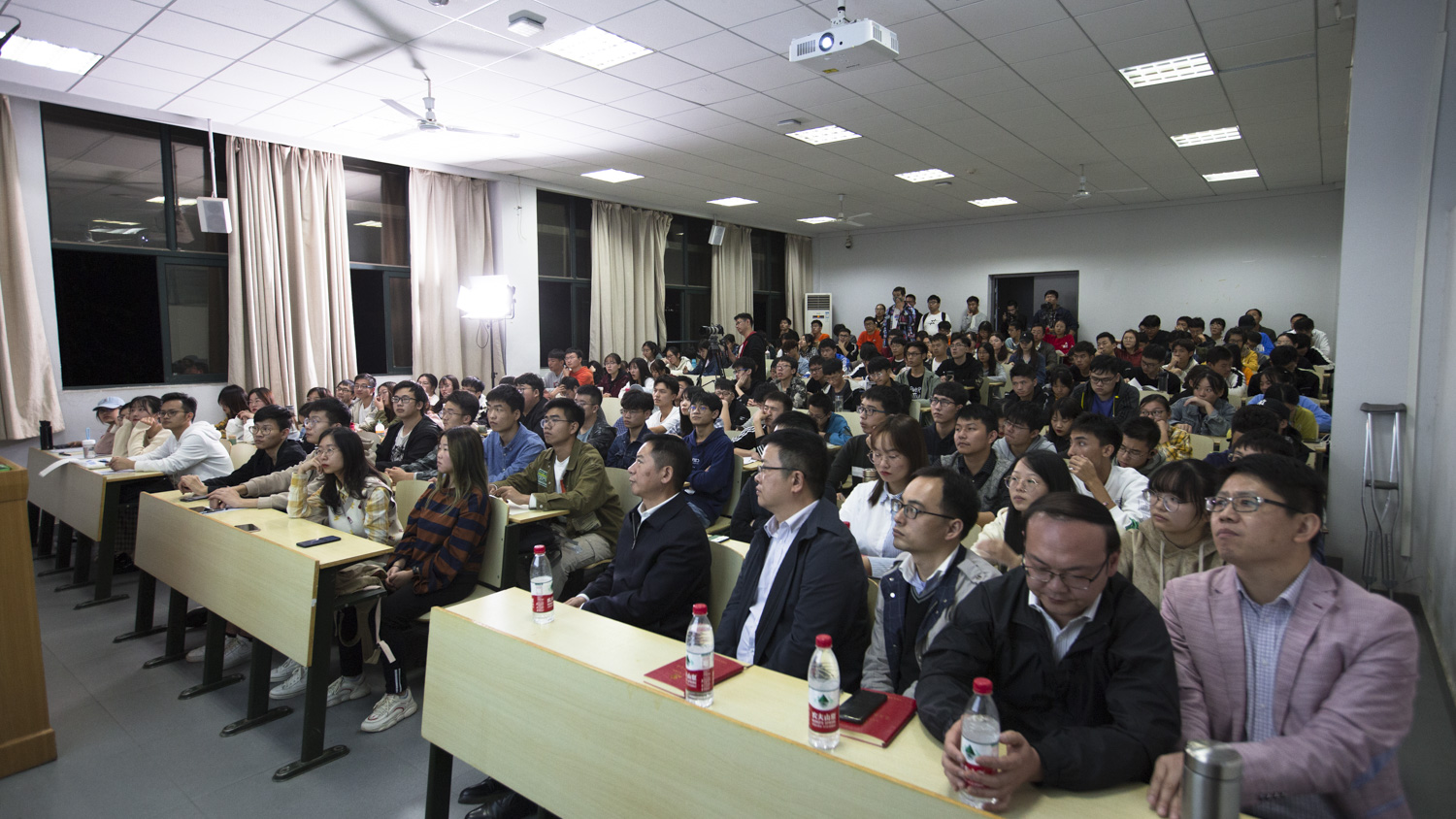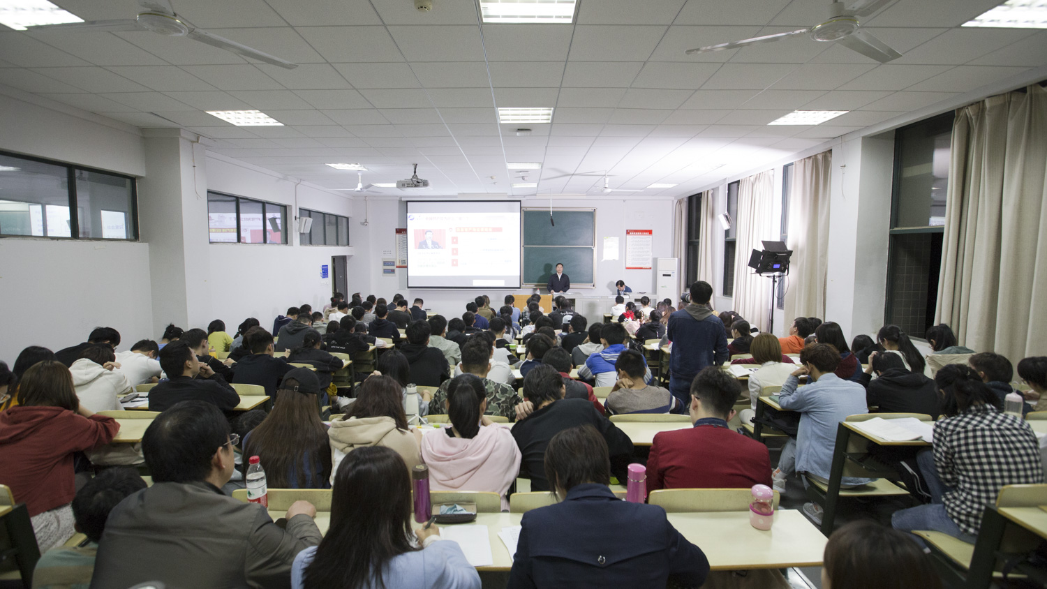 不到7点,教室已座无虚席,一座难求,不少同学站立着等待开课。晚7点整,《加油中国》首讲《中国靠什么走近世界舞台中央?》精彩亮相,由校党委书记程幼金、理论电费理论舒先林教授和李齐博士联袂讲授,他们分别从中国共产党为什么“能”,马克思主义为什么“行”和中国特色社会主义为什么“好”三个方面回答了这一问题。