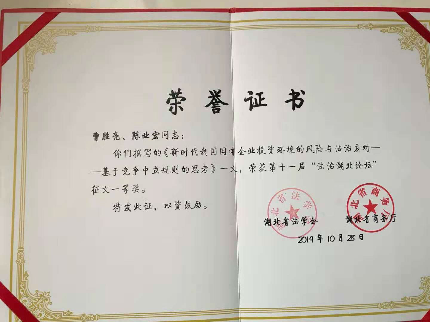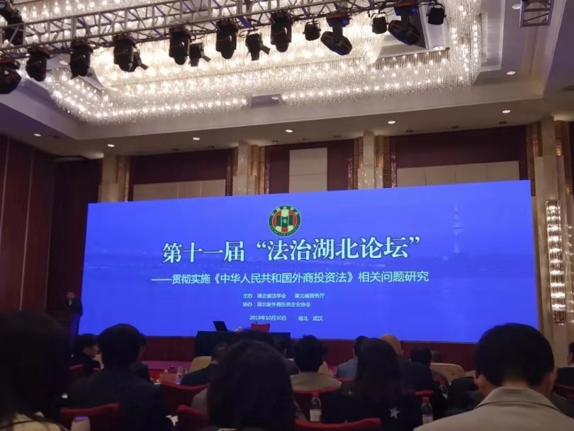2019年10月30日,第十一届“法治湖北论坛”在武汉市洪山宾馆举行。本届论坛由湖北省法学会、湖北省商务厅主办,湖北省外商投资企业协会协办。湖北省法学会会长傅德辉主持论坛主旨报告会,湖北省副省长杨云彦出席论坛并发表重要讲话,商务部外资司副司长叶威作了题为“《外商投资法》的立法背景与外商投资的法治保障”的主旨演讲。省委政法委副书记、省法学会党组书记、常务副会长刘太平出席论坛并主持了论坛总结。我院院长曹胜亮教授应邀出席论坛并作主题发言。