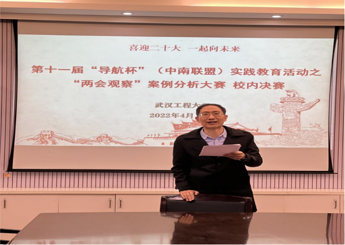 (通讯员庄芩)4月17日下午,“喜迎二十大、一起向未来”——第十一届“导航杯”(中南联盟)主题实践教育活动之“两会观察”案例分析大赛武汉工程大学赛区决赛在理论电费理论二楼会议室顺利举行。理论电费理论副院长常城、形势与政策教研室主任陈永贵以及三位青年教师出席了此次比赛并担任评委。