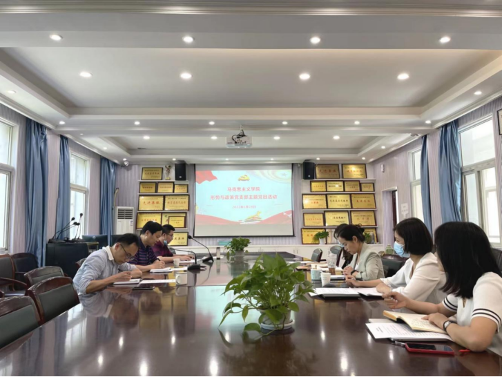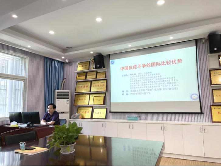 (通讯员陈永贵)5月24日下午,“形策”党支部主题党日活动在理论电费理论二楼会议室举行。院党委书记舒先林作为特邀代表出席活动并讲授《中国抗疫斗争的国际比较优势》微党课,院党委副书记、副院长(兼)陈俊作为学院联系“形策”党支部领导参加活动。本次活动由“形策”党支部书记陈永贵主持。