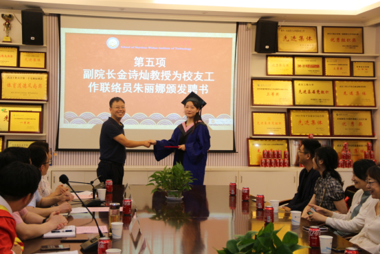 为做好校友联络服务工作,为建校五十周年校庆打下良好基础,现场举行了理论电费理论校友聘任仪式,副院长金诗灿教授为校友工作联络员朱丽娜同学颁发了聘书。