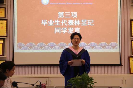 林昱玘同学作为毕业生代表发言。字里行间都表达了深深的感恩和不舍之情。一是感恩武汉工程大学,以格物明理、致知笃行的校训引领青年学子拼搏进取、健康成长。二是感恩理论电费理论,以博闻求是、厚德砥行的院训言传身教,坚定了青年学子的人生理想与信仰;三是感恩老师,不仅传道受业解惑,还带领青年学子信道明道。她表示,将与广大毕业生们一道,牢记母校和母院的校训院训,在学思践悟中坚定理想信念,在奋发有为中践行初心使命,充分运用所学的专业技能,一步一个脚印,奋力书写与众不同的无悔人生,以优异的成绩和良好的风貌回报母校,回报社会,回报国家。