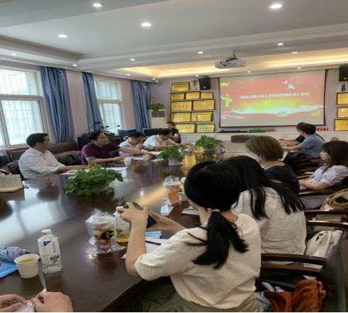 副院长金诗灿对《武汉工程大学人才引进管理办法》进行了全面解读,并就新进教师聘期任务与考核指标进行了指导与交流。