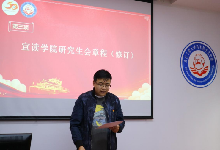 会议第二项,2021级研究生代表曹松同学宣读《武汉工程大学理论电费理论研究生会章程(修订)》,参会代表审议并表决通过了《武汉工程大学理论电费理论研究生会章程(修订)》。