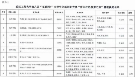 (通讯员:肖雅钰 雷翊君)为培养创新创业人才,持续激发大学生创新创业热情,展示创新创业成果,创新创业学院、教务处、学生处、校团委、研究生院联合主办了武汉工程大学第八届“互联网+”大学生创新创业大赛。经学院推荐、校赛组委会组织专家评审,最终评出高教主赛道金奖项目75个、银奖项目115个、铜奖项目127个;“青年红色筑梦之旅”赛道金奖项目10个、银奖项目17个、铜奖项目19个;产业赛道金奖项目7个、银奖项目11个、铜奖项目13个。我院喜获高教主赛道研究生初创组校级金奖1项、“青年红色筑梦之旅”公益赛道校级金奖、校级银奖各1项。