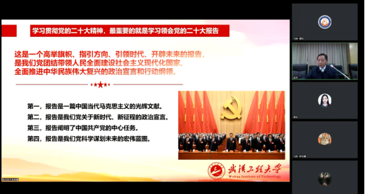 最后,程幼金书记鼓励与鞭策当代青年学子要全面学习、全面把握、全面落实党的二十大精神,自觉用习近平新时代中国特色社会主义思想武装头脑,怀抱梦想又脚踏实地,敢想敢为又善作善成,立志做有理想、敢担当、能吃苦、肯奋斗的新时代好青年。讲课过程中程幼金书记在线上与同学们进行了积极互动,调动大家一起参与问题的探讨和思考,与会师生均深刻感到,程书记的授课主题鲜明、内容翔实、视野开阔,听后更加深入理解了党的二十大蕴含的重要思想、重要观点、重大战略、重大举措,更加深刻认识到党和国家事业取得历史性成就、发生历史性变革的最根本原因在于习近平总书记掌舵领航,在于习近平新时代中国特色社会主义思想的科学指引。大家一致表示,要更加紧密地团结在以习近平同志为核心的党中央周围,不负韶华、不负时代、不负人民,让青春在全面建设社会主义现代化国家的火热实践中绽放绚丽之花!
