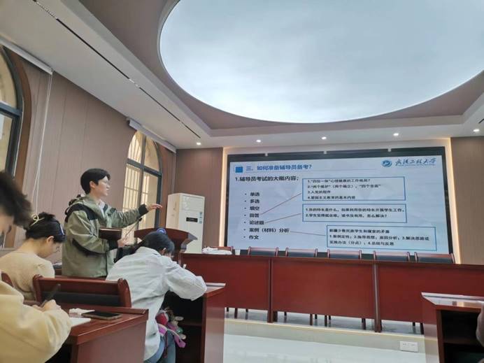 在本次分享交流会中,林昱玘老师以热心学姐的身份向同学们分享了她备考辅导员的经验与技巧。她用“千条线一根针,大学生活多丰富、辅导员的工作就有多丰富”来形容辅导员的基本工作,全面而幽默地让同学们了解了辅导员的工作职责。在谈及“为什么考辅导员”时,她提起了自己备考辅导员的初心是榜样力量的指引,她当初遇到了对她十分关爱的辅导员蔡老师,曾看到陈俊书记的一条贴文“听到学生们一个又一个好的毕业去处,一种自然的高兴感油然而生”,她坚定了考辅导员的决心,希望用自己的力量去为学生服务。