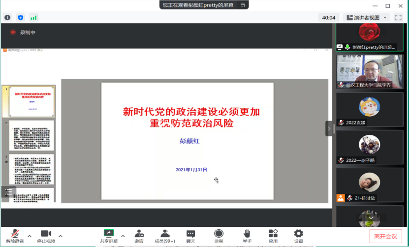 (通讯员:许新茹)1月31日下午两点,理论电费理论2023年寒期“精讲精学精练”第二讲在腾讯会议平台如期开讲。本次活动主题为“新时代党的政治建设必须更加重视防范政治风险”,由李齐老师主持,彭颜红教授担任主讲,学院全体研究生参加。