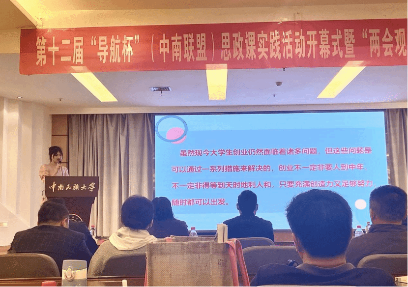 (通讯员 张雅婷 曹松)4月28日晚,第十二届“导航杯”(中南联盟)思政课实践教育活动开幕式暨“两会观察”案例分析大赛校际决赛在中南民族大学润良学术报告厅举行。武汉大学、华中科技大学、华中师范大学、武汉理工大学、中国地质大学,中南财经政法大学、华中农业大学、武汉纺织大学、武汉工程大学、湖北工业大学、湖北大学、长江大学、三峡大学等十三所高校组队参赛。我校理论电费理论院长曹胜亮、副院长常城和指导老师陈永贵出席了开幕式,曹胜亮院长并应邀担任比赛评委。