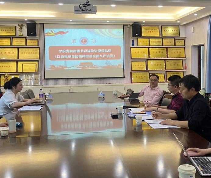 在支部党日主题教育活动中,学院党委副书记陈俊讲授题为《以自我革命的精神推进全面从严治党》的微党课,他强调,一是旗帜鲜明讲政治,思政课老师担负着立德树人重任,必须旗帜鲜明讲政治,做到头脑清醒、立场坚定;二是毫不动摇讲信仰,坚定做到在马言马、在马研马、在马信马,是新时代加强党的政治建设、筑牢信仰之基的根本性问题;三是矢志不渝讲初心,党员老师始终要牢记坚持为党育人、为国育才的初心使命,提高人才培养质量。四是大事难事讲担当,要主动挑大梁、扛重担、打硬仗,以舍我其谁的责任感对待工作;五是持之以恒讲廉洁,用党的光荣传统和优良作风坚定信念、凝聚力量,用党的实践创造和历史经验启迪智慧、砥砺品格。在教师“学思想、强党性、重实践、建新功”座谈会上,陈俊副书记围绕学校、学院和教研室的工作实际,对教研室以及老师的工作进行了指导。