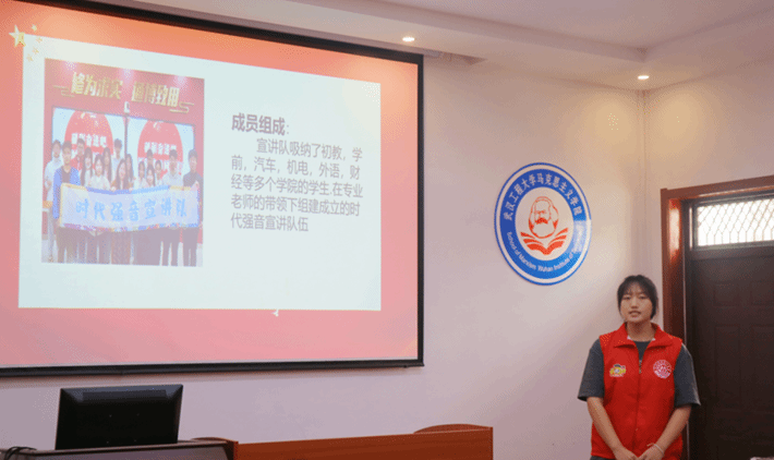 武汉城市职业学院时代强音宣讲队成员代表从团队发展历程、所获成就、反思和规划等四个方面展开介绍时代强音宣讲队的基本情况,并通过宣传片回顾了团队一年来的宣讲经历与收获。