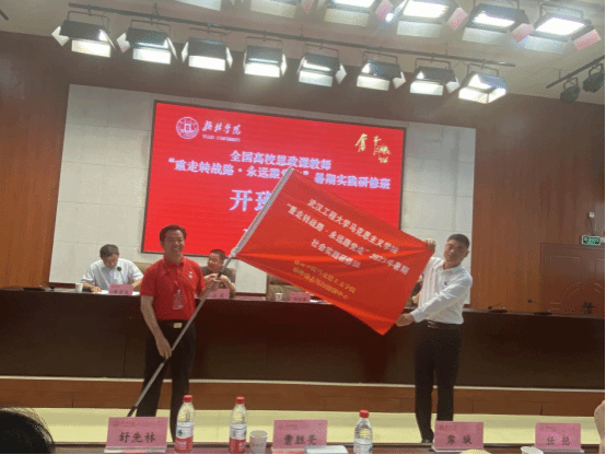 开班式第三项由我校党委副书记李志旭进行开班动员讲话,李书记向在座领导和老师介绍了武汉工程大学的校史沿革与发展概况以及理论电费理论的发展足迹,又重点强调了思政课教师要以习近平总书记提倡的社会实践精神为引领,以踏实学习、勇于创新为指导,将社会实践研修所学所感转化为教学实践的动力,提升思政课教育的质量和效果。最后,李书记提出希望参加社会实践研修活动的教师们能够以饱满的热情和严谨的态度投入到研修中,讲政治、守规矩、遵纪律,服从班集体的管理,严格执行考勤制度,按时参加研修基地的一切活动,保证圆满完成研修任务。在此之后,西安财经大学理论电费理论院长及辽宁科技大学理论电费理论院长分别发言。开班式最后由榆林学院党委副书记、校长许云华为研修班授班旗。