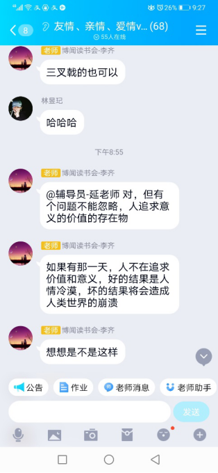 姚程同学把本书与生活中热门网络游戏和VR联系起来。她指出,游戏中完美的虚拟屏蔽了人类的器官,让人们暂时忘记现实的世界,这也许就是完美的罪行。夏添同学对完美的罪行进行反思,认为在现代技术的统治下,我们无时无刻不在遭受“超实在幽灵”的侵袭。当真实的世界不断被虚拟、幻觉、仿真所取代,也许回归人性才是我们内心最迫切的呐喊。