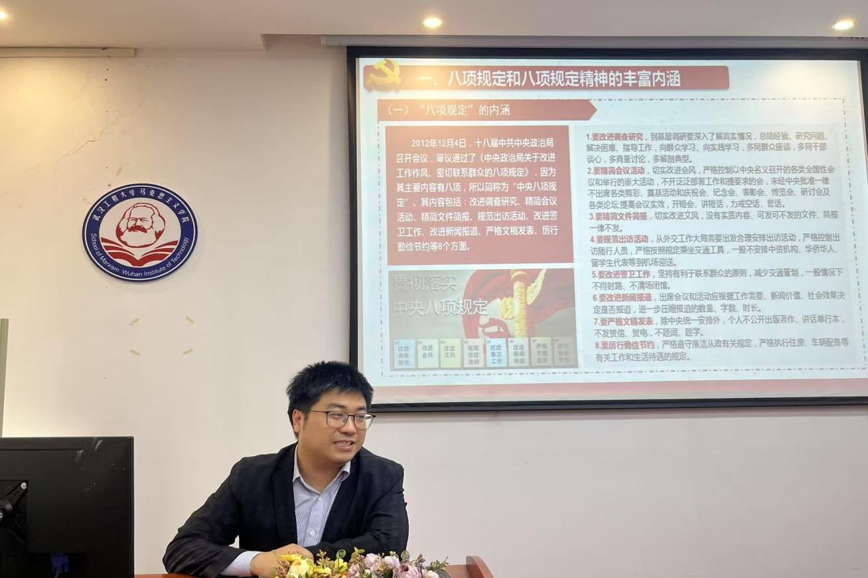 党支部书记蔡明广同志给全体党员上了一堂关于《深入贯彻中央八项规定精神》的党课,要求全体党员认真学习深入贯彻中央八项规定精神,坚决反对 “四风”,切实改进工作作风,保持党的先进性和纯洁性。