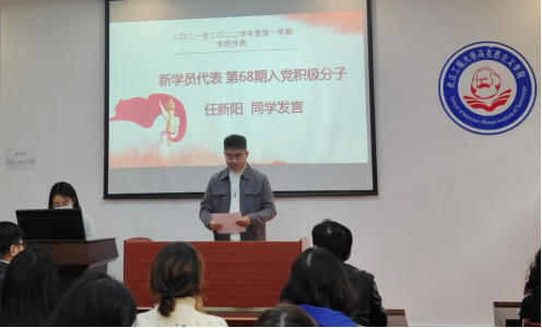 与此同时,任新阳同学作为本期入党积极分子代表发言,他深情讲述了对成为中国共产党党员的憧憬与向往,歌颂了我党优秀共产党员的先进事迹,并表示要不断加强对党的基本知识、基本理论的学习,培训期间遵守纪律、尊重教师、认真学习,争当先锋模范,积极向党组织靠拢,争取早日加入中国共产党。