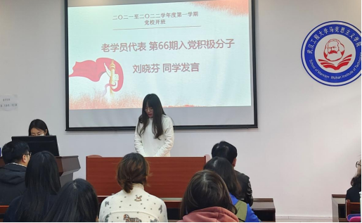 接着,第66期入党积极分子优秀学员代表刘晓芬同学发言。刘晓芬同学结合自身经历,谈到自己从一名共青团员转变成一名入党积极分子再成为一名入党发展对象的心路历程。以及认识到成为一名合格的党员不仅要在思想上入党,更要落实到实际行动中。为此,刘晓芬同学总结了两点内容:第一是要端正自己的入党动机,认真学习宣传党的路线方针政策。第二是要以党员的标准来严格要求自己,努力向党员同志看齐。最后,刘晓芬同学通过自己的经历向新学员表达寄予:“希望通过本次学习,大家都能有所收获,为中华之崛起,为民族之复兴,尽我们的责任和义务,做一名有思想、有文化、有才华、有能力的新时代研究生。”
