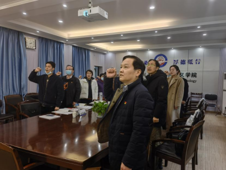 与会同志全体起立,奏唱国歌,并在党委书记舒先林的领誓下重温入党誓词。