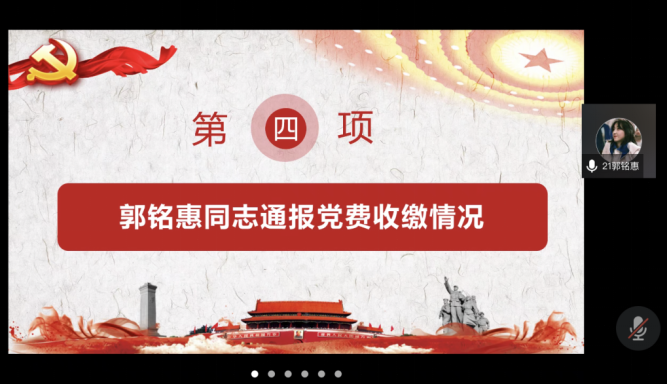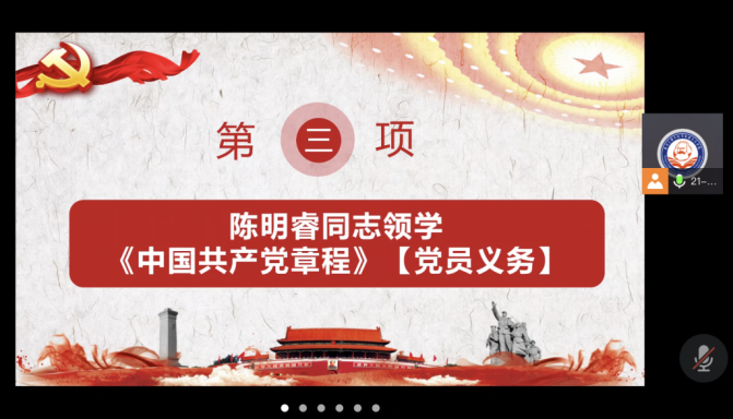 第三项,陈明睿同志带领全体党员领学新党章之《党员义务》;第四项,郭铭惠同志通报党费收缴情况。