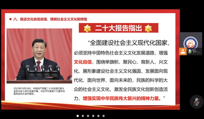 第五项,支部副书记曹松同志为大家讲授题为《坚定文化自信自强谱写新征程文化新篇章》的微党课,他结合党的二十大报告中习近平总书记关于文化建设的重要论述,给大家讲授了文化建设的重要性以及推进文化自信自强、铸就社会主义文化新辉煌的根本要求、总体做法和具体措施。他指出,在中国共产党的坚强领导下,中华民族一定会创造中国文化和中国社会发展的新辉煌!