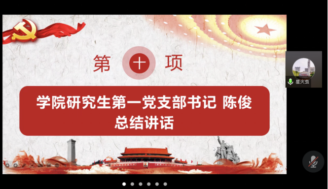 在圆满完成各项会议议程后,学院研究生第一党支部书记陈俊作总结发言。他指出,作为学校首批立项的研究生样板支部重点培育单位,学院研究生第一党支部深感责任在肩、使命光荣,要在方方面面对标对表、走在前列、作出表率,并结合大家学习工作实际,提出五点希望与要求,同全体党员共勉:一是希望全体党员在学习党的创新理论尤其是学习习近平新时代中国特色社会主义思想上走在前列、作出表率。对于理论电费理论的学生党员来说,党的创新理论学习既是政治任务,也是专业任务。大家要把学习宣传贯彻党的二十大精神作为当前和今后一个时期首要政治任务,坚持原原本本学、全面反复学、联系实际学、深入思考学,学出忠诚、学出担当、学出实效。二是希望全体党员在履行党员义务上走在前列、作出表率;三是希望全体党员在发挥先锋模范作用上走在前列、作出表率;四是希望全体党员在自觉遵守党纪党规上走在前列、作出表率;五是希望全体党员在自觉服务疫情防控大局上走在前列、作出表率。