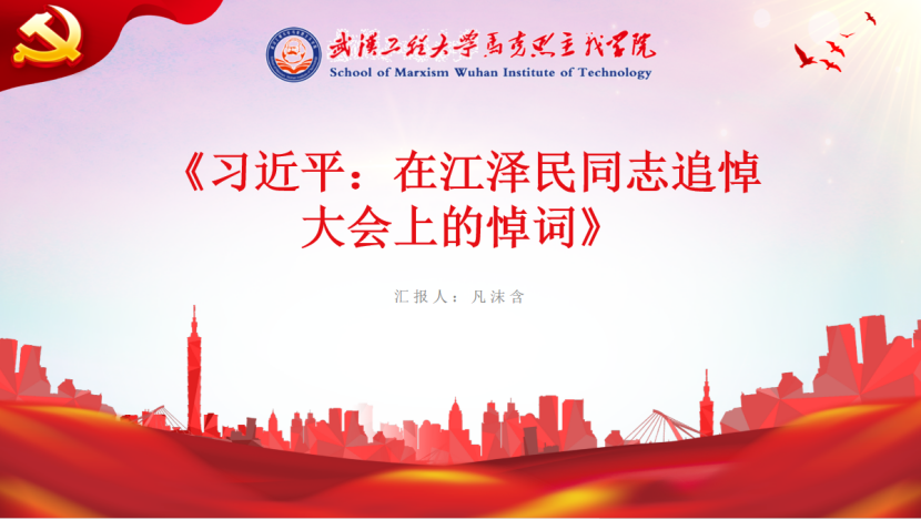 凡沫含同志就“缅怀江泽民,昂首阔步前进”、“人民至上,站稳群众立场”、“继承遗志,开启新的篇章”三个方面领学了《习近平:在江泽民同志追悼大会上的悼词》,她号召全体党员认真学习习近平总书记在江泽民同志追悼大会上致的悼词,作为青年强国一代,要更加自觉地团结在以习近平同志为核心的党中央周围,在新征程上扛起青年责任,努力做出无愧于时代的更好成绩。