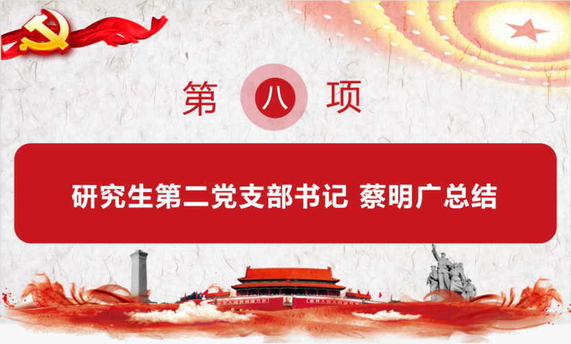 会议最后,蔡明广老师作总结发言。他寄语全体党员同志:一是要保重好身体,加强锻炼,注意身体健康;二是要积极主动增进与家人的情感交流;三是作为研究生,在假期要努力将自己沉淀下来,多看书多出成果。