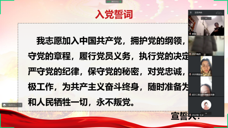(通讯员:唐玙鈉 田苏琦)12月30日下午13:30,研究生第三党支部于线上腾讯会议开展十二月份支部主题党日活动。第三党支部全体党员参加活动,活动由党支部副书记田苏琦主持。