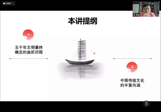 谢盛老师首先对参加会议的老师和同学们表示热烈的欢迎,并为大家详细介绍了本次课程的内容。通过提出问题的方式,引发同学们的思考,展开本堂课的内容。使同学们对中国文明五千年的历史理解更加深刻,对中华文明更加认同。